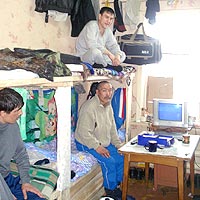 Общаться с ними легче было бы на свежем воздухе. Уж слишком, как бы помягче выразиться, спартанские условия в помещениях, занимаемых приезжими. В одной небольшой комнатенке площадью примерно в девять «квадратов» — четыре грубо сколоченных двухъярусных лежака. На семи настилах размещаются люди, на последнем, голом — их дорожные сумки. Повсюду в «художественном» беспорядке развешены и разбросаны вещи разной степени чистоты. Живописно одеты и сами узбекские гости — кто в вязаной шапке, несмотря на духоту в комнате, а кто в удивительных «трико», сильно смахивающих на кальсоны. Вся честная компания культурно убивала время, вперившись в телевизор, где какая-то тетенька как бы пела, попутно избавляясь от своих одежд.