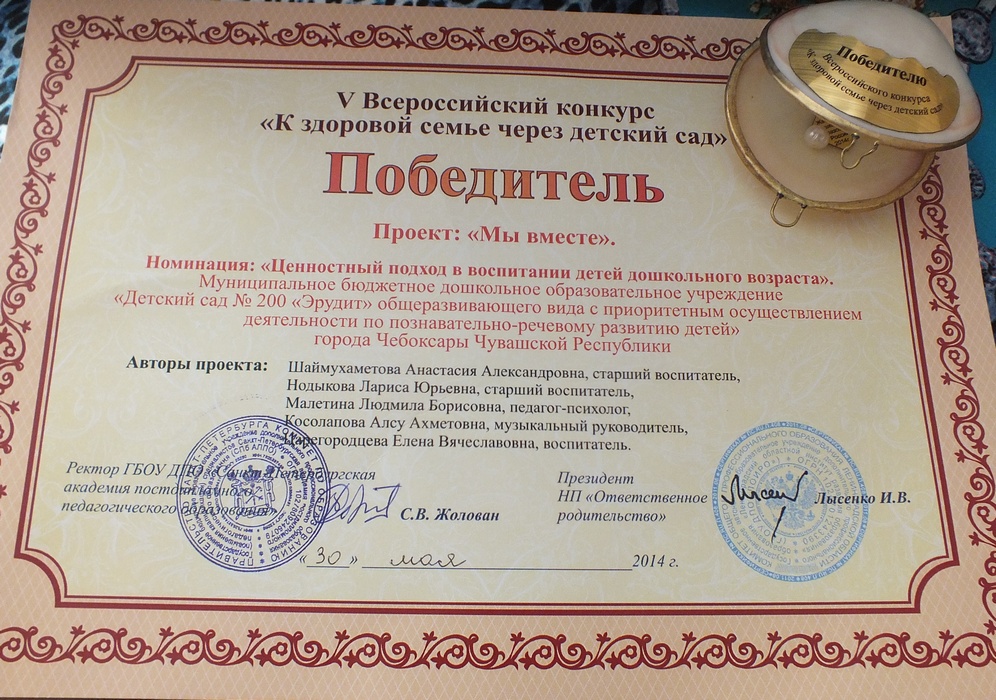 Чебоксарский детский сад стал обладателем «Жемчужины дошкольного образования России – 2014». Всероссийский конкурс «К здоровой семье через детский сад» проходил при поддержке полпреда Президента РФ в СЗФО и Комитета по вопросам семьи, женщин и детей Государственной Думы РФ. Проект МБДОУ «Детский сад № 200» г. Чебоксары под названием «Мы вместе» одержал победу в номинации «Ценностный подход в воспитании детей дошкольного возраста».