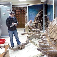 А вот кости и зубы мамонтов, да и вся палеонтологическая коллекция предстанет перед глазами посетителей новой экспозиции почти в том же сборе. Такими экспонатами музеи быстро не прирастают. Однако художникам предстоит показать эти раритеты в другом контексте, по которому несложно будет догадаться, сколько захватывающих приключений, людей и царств могут заключать в себе древние черепки, позвонки, детали украшений и черно-белые фотографии. По замыслу Юрия Ювенальева, весь археологический отдел должен вместить миллионы лет не только фактически, но и образно. Поэтому вход в эту часть здания мастерят в виде древней пещеры. Для этих целей используют пенопласт, ткань и картон. Древними росписями пещерных стен занимаются студенты худграфа педагогического университета. В зал привезут даже доисторический валун, который можно будет гладить, приобщаясь к историческому космосу. Каждый угол «первобытного» зала – целая эра из истории наших предков. В одном полностью раскрывается технология изготовления жилья из шкур. Вот наступила зима, и наши дальние родственники начали из подручных материалов и результатов охоты сооружать себе жилище, комментирует свои действия Юрий Ювенальев, привязывая шкурки к каркасу из веток полосками из натуральной кожи. Господин оформитель поясняет, что домыслы в музейном деле неуместны. Есть лишь место так называемой художественной реконструкции. Поэтому ему очень хочется посадить рядом с этим жилищем «первобытных людей». Пока вопрос на стадии обсуждения. Работа в этом зале ведется в тесном сотрудничестве со специалистами гуманитарного института. Экспозиция делается строго по материалам раскопок и научных изысканий.