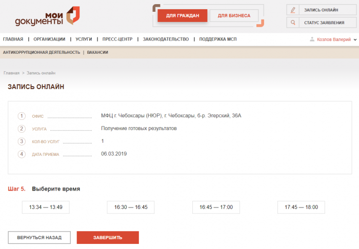 В личном кабинете будет отображаться история всех ваших заявлений и дел. Здесь же можно распечатать талон на предварительную запись в МФЦ.
