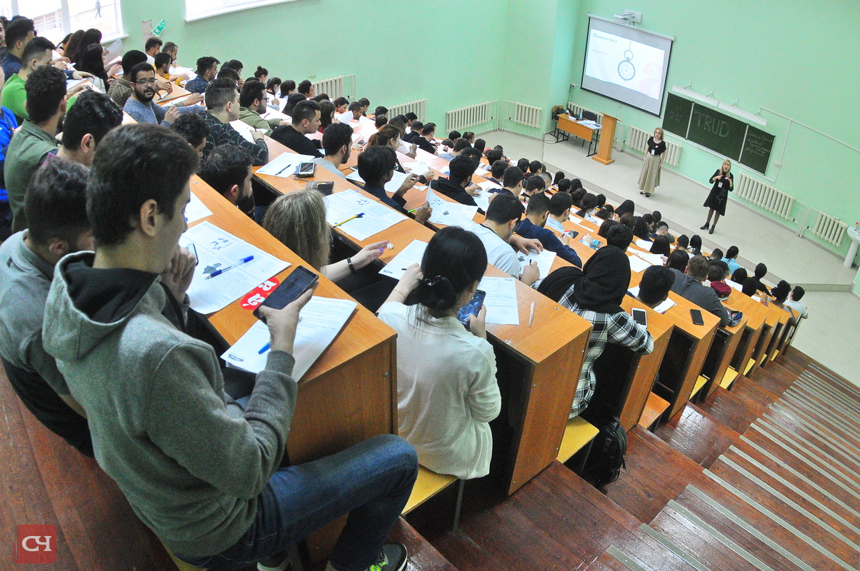 В аудитории, где диктант пишут иностранцы, «диктатором» выступила доцент ЧГУ Мария Петрова. Она показывает объем диктанта: пять строк. Их также написал Павел Басинский, который составил текст и для основного диктанта. Но, кроме того, иностранцам нужно было выполнить несколько заданий, решить кроссворд. Этот диктант больше похож на олимпиаду для наших школьников по иностранному языку, но для тех, кто только начинает изучать русский язык, – это серьезное испытание. В отличие от беззаботных русскоговорящих студентов они более сосредоточены и серьезны.