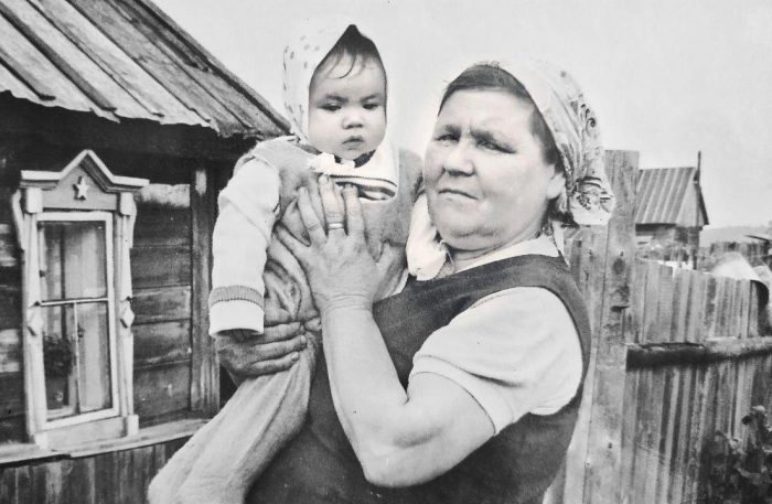 Фото из архива семьи Малайкиных: Маленькая Таня со своей бабушкой Анной Мефодьевной у своего дома на Приверхе.