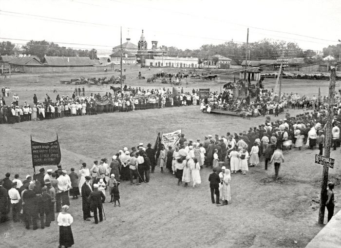 Тропа, идущая влево вверх — это начало будущей улицы Розы Люксембург. Левее нее до Мясного (Речного) переулка все было тоже заполнено людьми, так что на снимке видна лишь небольшая часть собравшихся на митинг. Красная трибуна стоит на том же месте в центре площади, между ней и будущей улицей Союзной видны подводы — площадь, хоть и стала Красной, но в базарные дни (пятница и понедельник) все еще оставалась центром торговли.
