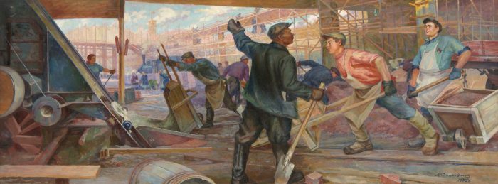 Картина: Спиридонов М.С. Ударная бригада бетонщиков на строительстве КВРЗ. 1935 г. Холст, масло. 135 х 350.
