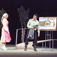 Другой важный плюс постановки – замечательная музыка Тимофея Фандеева, поданная в современной обработке. А минус – сценография В. Шведова: стилизация деревенского рая с несколькими березками, уличными фонарями и лубочными облачками на лазурном небе.
