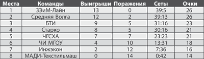 Примечания: а) вторая и третья команды в таблице представляют Новочебоксарск, остальные – Чебоксары; б) результат оставшегося матча «ЗЭиМ-Лайн» – «Старко» уже не влияет на окончательное распределение мест; в) финальные поединки за 1 место («ЗЭиМ-Лайн» – «Средняя Волга») и за «бронзу» (БТИ – «Старко») состоятся 24-26 апреля.