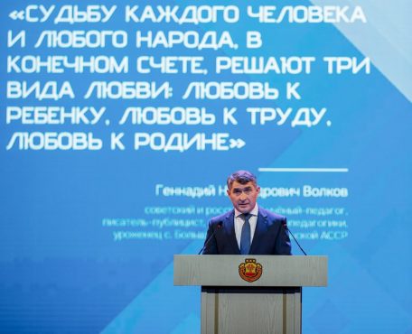 …«Судьбу каждого человека и любого народа, в конечном счете, решают три любви — любовь к ребенку, любовь к труду, любовь к Родине» — так в свое время написал в своей книге «Созвездия земли» Геннадий Волков, педагог, основатель этнопедагогики, писатель и публицист. Именно эти слова процитировал Олег Николаев, начиная свое выступление. Практически эта цитата стала эпиграфом Послания. Слова, написанные еще в прошлом веке, как нельзя лучше отражают суть сказанного Николаевым далее.