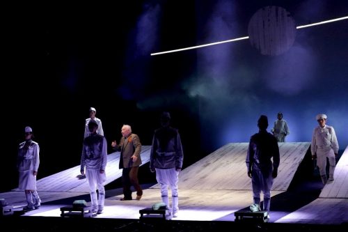 Но есть еще один момент, цепляющий ухо. В кульминационных точках сценического действа мелодическая линия теряет ясно очерченный облик, распадаясь на миллионы рассредоточенных звуков, будто молекула на атомы. Какофония, хаос, дисгармония… Или некий «белый шум», позволяющий слышать голоса тех, кто когда-то пал смертью храбрых? Неслучайно по замыслу художника Марии Шуплецовой декорации, реквизит и костюмы, однотонные, немногословные и графичные, тоже выкрашены в белый цвет. И бледнолицее солнце, насмерть пронзенное сияющим копьем, и сухие деревья, безвольно повисшие вверх тормашками как символ перевернутости мира, и военная форма, в которую одеты актеры. Как будто кто-то безмолвно напевает известную песню: «Мне кажется порою, что солдаты, с кровавых не пришедшие полей, не в землю эту полегли когда-то, а превратились в белых журавлей…»
