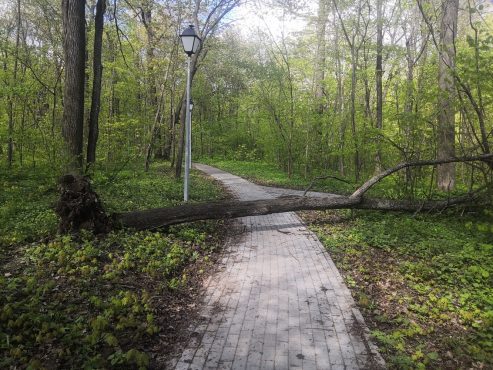 К сожалению, пройти по всему маршруту, выложенному тротуарной плиткой, не получилось — на одном из участков дорогу преградило рухнувшее дерево. Обойти растение, вырванное из земли с корнем, тоже не удалось — оно заняло и прилегающую тропинку. Так что благоустройство порадовало, но не совсем.