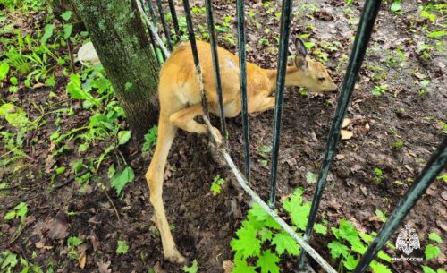 Попытка погулять в городском парке Канаша для молодой косули закончилась очень плачевно — она застряла в ограде.