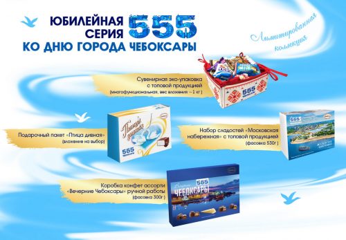 А посмотреть действительно есть что. В первую очередь привлекают внимание новинки — праздничные упаковки с символикой 555-летия столицы Чувашии: наборы конфет с топовой продукцией фабрики «Московская набережная», «Вечерние Чебоксары», легендарная «Птица дивная» в подарочном формате. А еще — специальная разработка для гостей Чебоксар, в чей туристический маршрут обязательно включен фирменный магазин «АККОНД» — набор сладостей в экоупаковке с чувашским орнаментом.