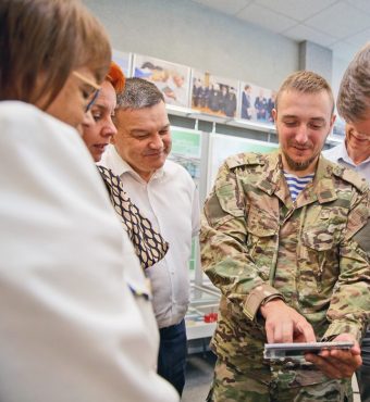 Юрий Богданов показывает Вячеславу Борисову, Наталии Колывановой и Наталии Партасовой видео, в котором наши бойцы благодарят за бесценную поддержку. Фото Максима Васильева