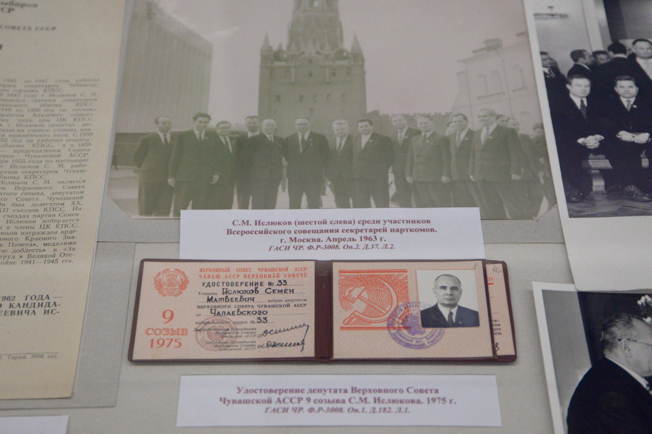 Предварила форум выставка под названием «Счастье — служить народу». Среди экспонатов документы, обозначающие вехи жизненного пути — служебные удостоверения, почетные грамоты, фотографии. Вот отчет молодого Семена Матвеевича о производственной практике. А это выписка из протокола о присуждении ему ученой степени кандидата юридических наук. Здесь он вместе с земляком, Космонавтом-3 Андрияном Николаевым на колхозном поле в Мариинско-Посадском районе. Есть и редкие кадры — например, на охоте. Любил Семен Матвеевич и рыбалку. Говорят, у него в машине всегда лежала удочка на всякий случай. «У нас 679 единиц хранения, большинство — из личного фонда Ислюкова», — рассказывает Вероника Кочешкова, главный архивист Госархива современной истории Чувашии.