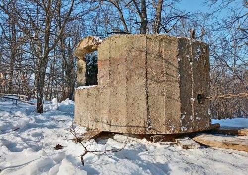 Мужчины-энтузиасты для подъема тяжелой конструкции используют ручную лебедку. Каждый день продвигаются метров на пять, не больше. Но до этого немалого труда стоило извлечь пулеметный колпак из земли. Кстати, помощь им оказали известный в республике археолог Михаил Федулов, участники поисковых и школьных археологических отрядов. Сейчас на месте, где стояло сооружение, осталась только яма, наполненная водой. И даже под снегом виден взрыхленный след от волочения.