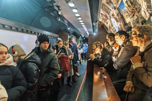 …«Военный эшелон», растянувшийся почти на всем протяжении железнодорожной платформы, впечатлял еще издалека. Пассажирские вагоны будто прибыли в Чебоксары из прошлого: на каждом — черно-белые кадры фотохроники и знаменитые лозунги «Наше дело правое. Мы победим!», «Боевой привет шлет Родина героическому Ленинграду!», «Мы из Берлина». А внутри каждого из десяти вагонов — ожившие эпизоды военных будней, с документальной точностью воспроизведенные создателями этой уникальной иммерсивной выставки.