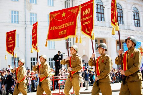 12.00–13.30 Торжественное прохождение сводного полка и военной техники, проспект Ленина — площадь Республики