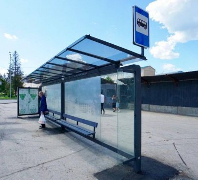У конструкции необычный дизайн — в оформлении использовано панорамное остекление со стилизованными видами города, установлен прочный козырек из тонированного стекла. Кроме того, сооружение оборудовано USB-разъемами для зарядки гаджетов, электронным табло с расписанием движения транспорта и системой видеонаблюдения.