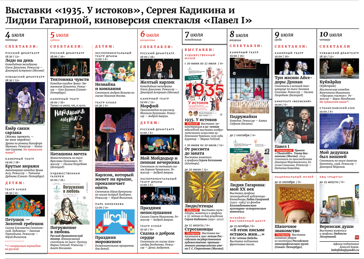 Культурная афиша с 4 по 10 июля Автор: Советская Чувашия Версия для печати chat_bubble_outlineКомментариев нет