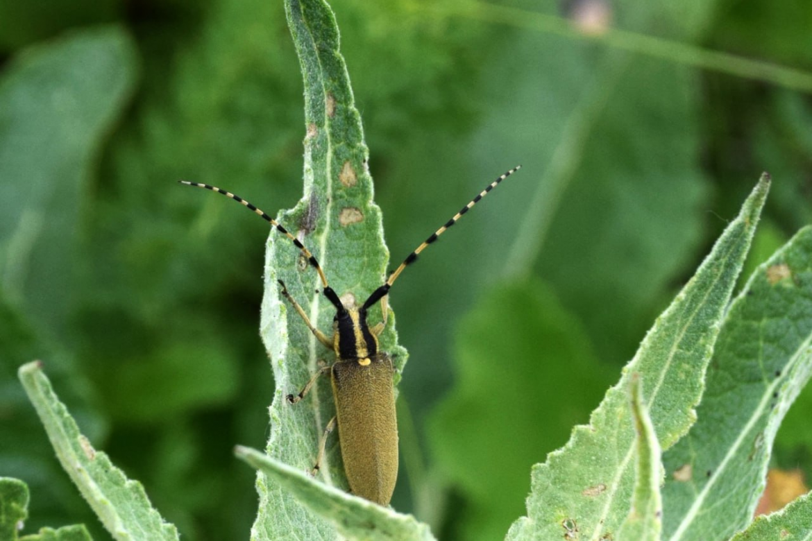 Жук-усач Agapanthia kirbyi на листе коровяка метельчатого. Фото Маргариты Гафуровой