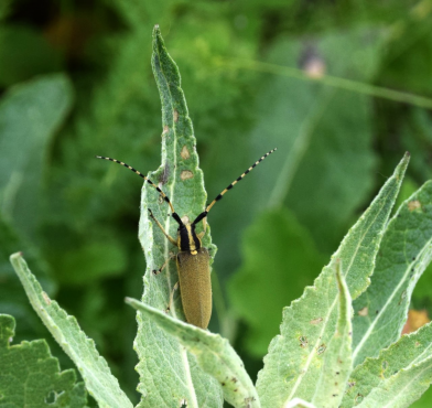 Жук-усач Agapanthia kirbyi на листе коровяка метельчатого. Фото Маргариты Гафуровой