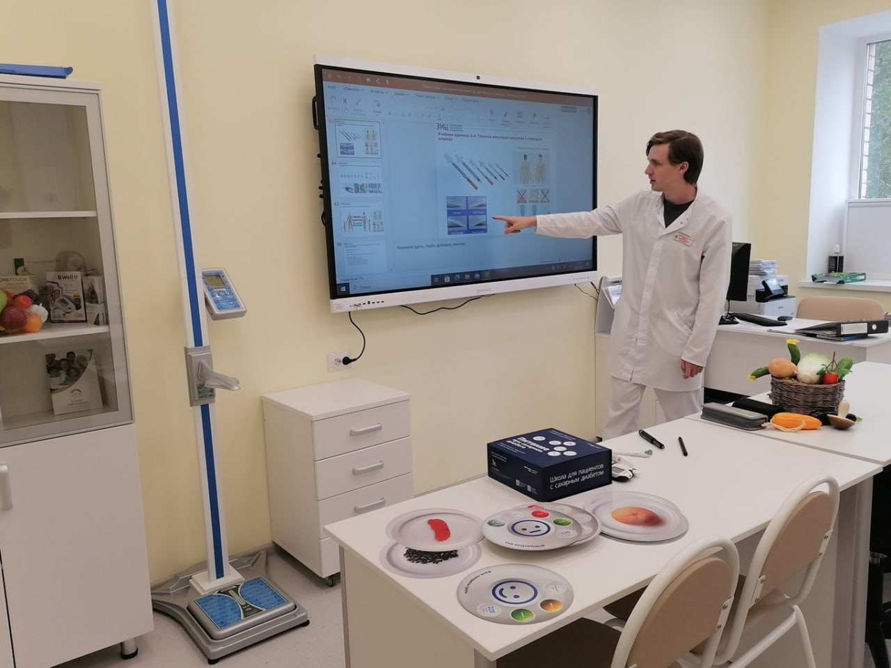 Кабинеты для занятий оснащены капитально: интерактивная панель, муляжи продуктов, глюкометры, весы, ростомер и другие полезные вещи, удобная мебель. Качественные изменения стали возможны благодаря федеральной программе «Борьба с сахарным диабетом» нацпроекта «Продолжительная и активная жизнь».