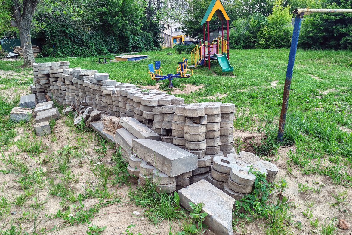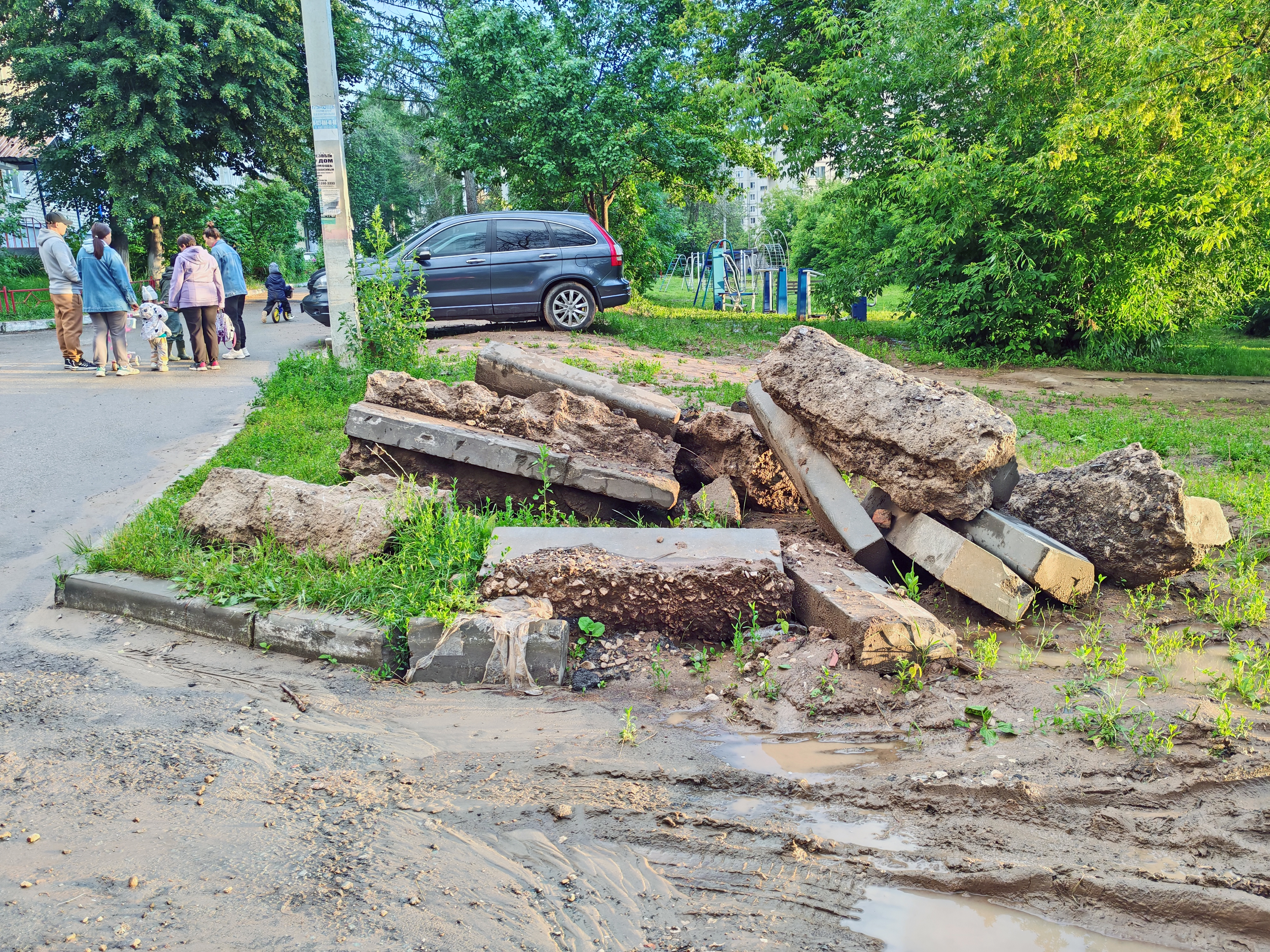 А раскопки были масштабные, коснулись участков, где располагаются гостевые парковки и пешеходная дорожка. Энергетики оставили после себя горы сломанных бордюров и плиток. Эти железобетонные отходы соседствуют с детскими и спортивными площадками и представляют опасность для местных ребятишек. Поскольку до восстановления разрушенного благоустройства дело так и не дошло, в дождь машины вынуждены парковаться прямо на лужах, а пешеходы — скользить по глине.