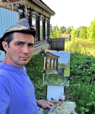 «Этюд на улице Красноармейская. В этом месте в Мариинском Посаде чувствуешь себя, словно в 19 веке», — подписал он фотографию с этюдником у старого дома с резными наличниками на своей страничке ВКонтакте. А вот так поэтично рассказал об одной из улиц, где работал за холстом: «Старые дома Мариинского Посада помнят многое… Из-за кружевных занавесок окон второго этажа когда-то выглядывали дородные мещанки, допивая чай из сверкающего самовара, размачивая в чашке кусочки каменного сахара или лакомясь ложечкой земляничного варенья… Они наблюдали проходящих горожан разных сословий. По этой улице везли огромный новый колокол для Тогаевской церкви, доставленный по Волге. Мой прадед, Никифор Михайлович, заказывал наличники для новой избы мастеру из Мариинского Посада, их везли на телеге, тоже, возможно, по этой улице. <…> Пока писал этот этюд, я погружался в чудесные ощущения уездного портового городка императорской эпохи, а также во времена своего детства, когда центр Чебоксар, где я вырос, жил в таком же неспешном и уютным ритме. Там также по городу могли гнать хворостиной корову домой, воду носили из колонки, а старый асфальт зарастал бурьяном и крапивой, и все чердаки и заборы у ближайших домов были нашими!»