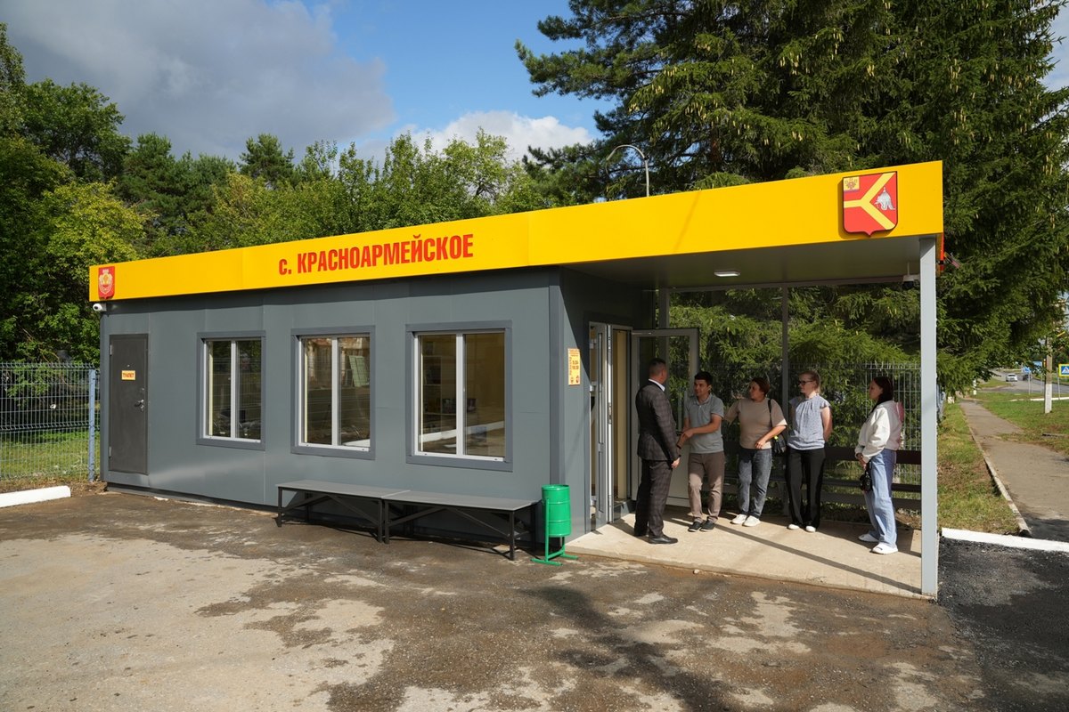 В селе Красноармейское руководитель региона пообщался с жителями возле первой в округе «умной остановки». Работы по обустройству павильона были выполнены за счет гранта Главы Чувашской Республики. Утепленный остановочный пункт оборудован кондиционером, водопроводом, канализацией, санузлом и системой видеонаблюдения, работающей на солнечных батареях. Для удобства пассажиров, ожидающих транспорт, объект оборудован доступом в сеть интернет (Wi-Fi), здесь также есть мини-библиотека, развлекательные настольные игры и телевизор. Кроме того, в помещении установлена сенсорная панель с возможностью просмотра расписания движения автобусов, а также отправки обращений напрямую к главе муниципального округа.