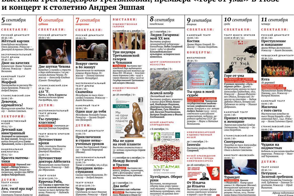 Культурная афиша с 5 по 11 сентября Автор: Советская Чувашия Версия для печати chat_bubble_outlineКомментариев нет