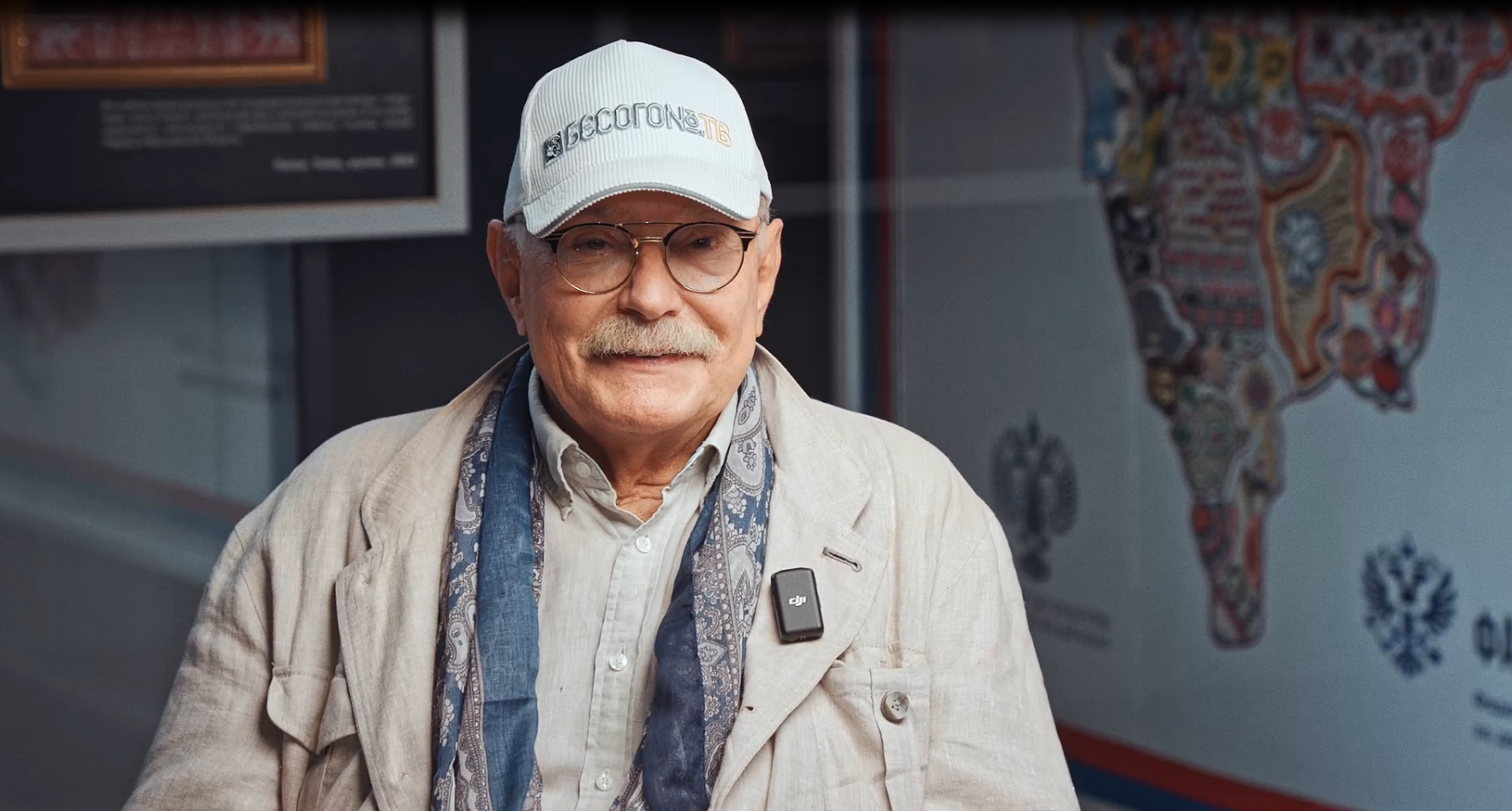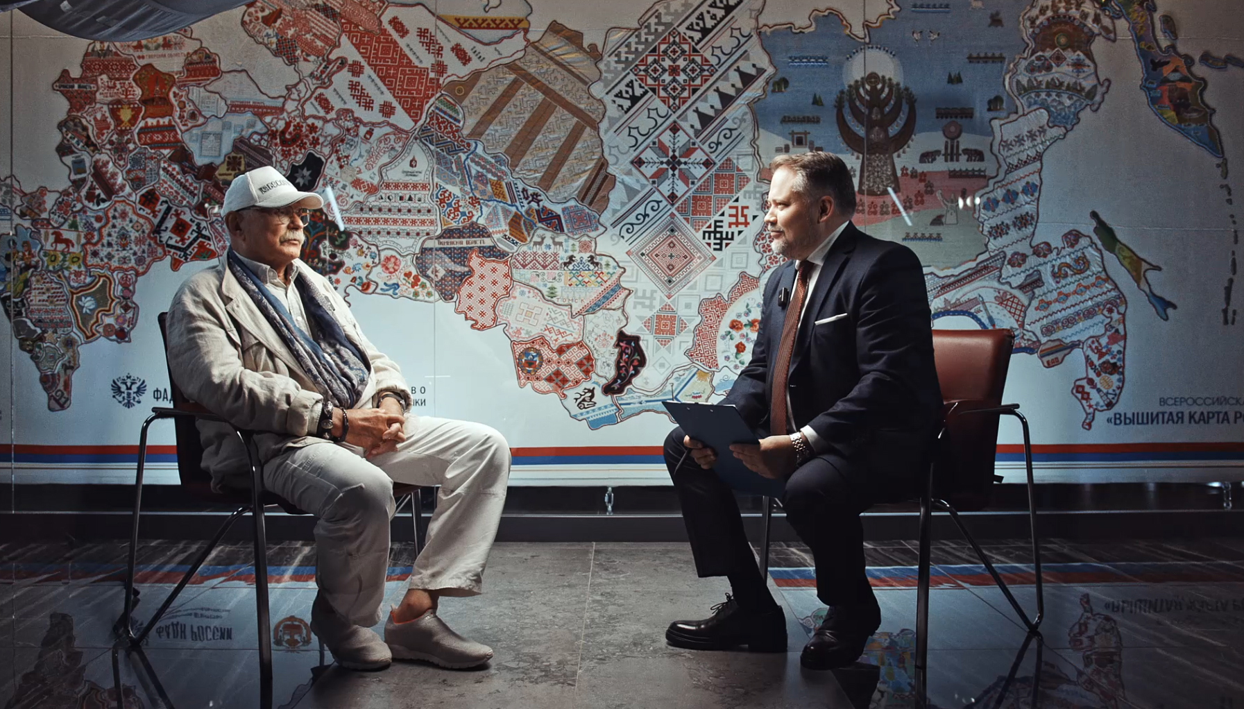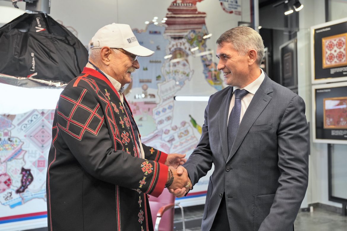 Перед интервью Никита Михалков вместе с Главой Чувашии осмотрели экспозиции в Музее Вышитой карты России. Фото glava.cap.ru