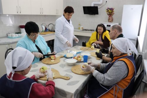 Идея испечь что-нибудь вместе с жителями витала в воздухе, и директор интерната Гузель Иванова предложила начать с круассанов. Энтузиазм подхватили все. В уютной бытовой комнате быстро собралась настоящая кулинарная команда. Ольга Сидорова, Алена Максимова и Юрий Клементьев ловко управлялись с яблоками: фрукты чистили, резали на дольки и обваливали в сахаре, чтобы завернуть в слоеное тесто.