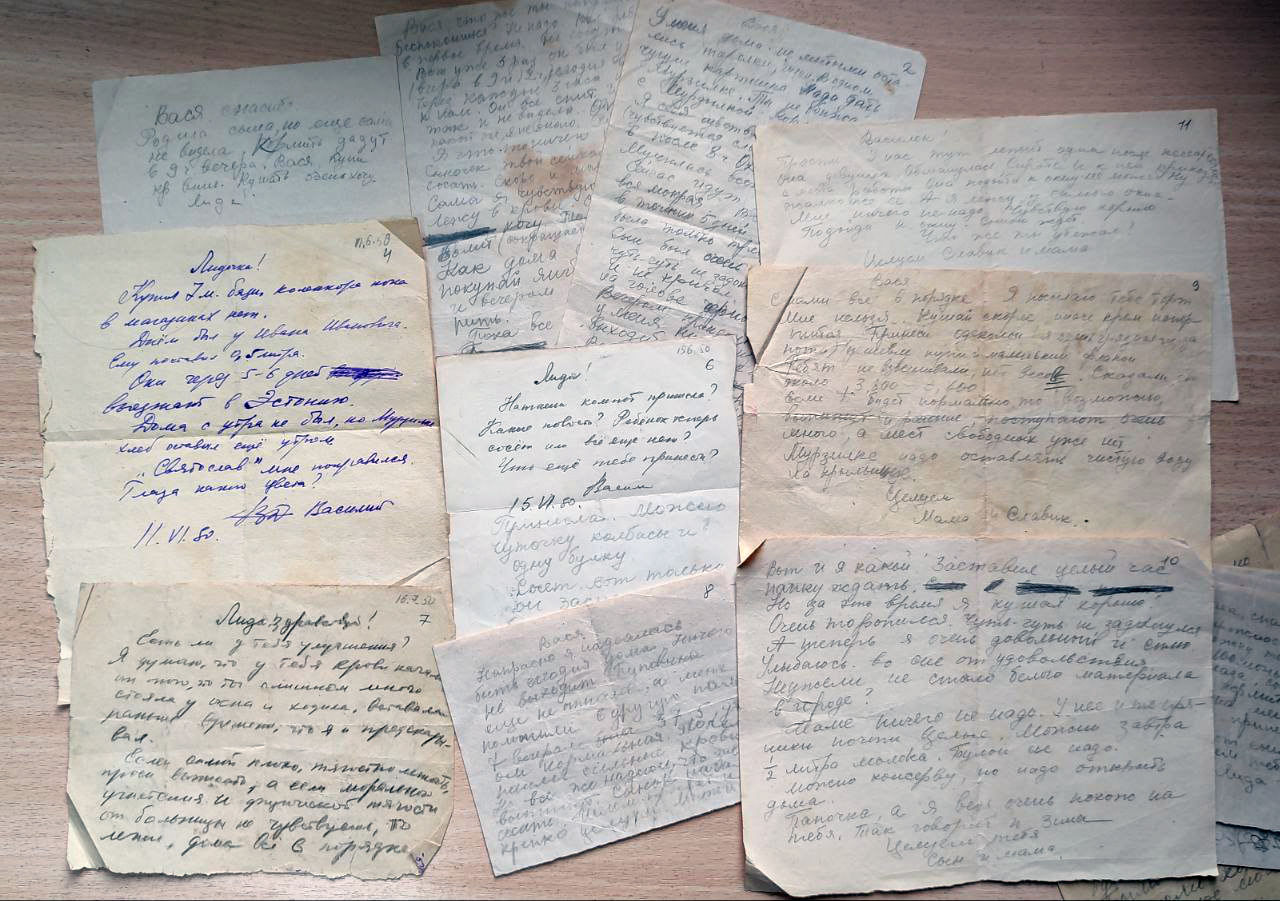 «Лида, здравствуй! Есть ли у тебя улучшения? Я думаю, что у тебя крови начались от того, что ты слишком много стояла у окна и ходила, вставала раньше времени, что я и предсказывал. Если самой плохо, тягостно лежать, проси выписать, а если морального угнетения и физической тягости от больницы не чувствуешь, то лежи, дома все в порядке. Если не выписываешься, что тебе принести? Василий. 16.VI.50».