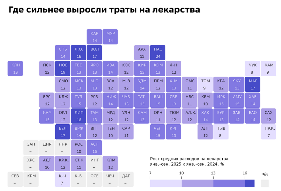 Больше всего за год выросли траты на лекарства в Ненецком автономном округе — на 24% в номинальном выражении (до 2980 рублей), Новгородской области — на 19% (до 2320 рублей) и Белгородской области — на 17% (до 2470 рублей). Наименьший прирост зафиксирован в Приморском крае — 6,8% (до 2900 рублей) и Карачаево-Черкесии — 6,9% (до 2480 рублей).