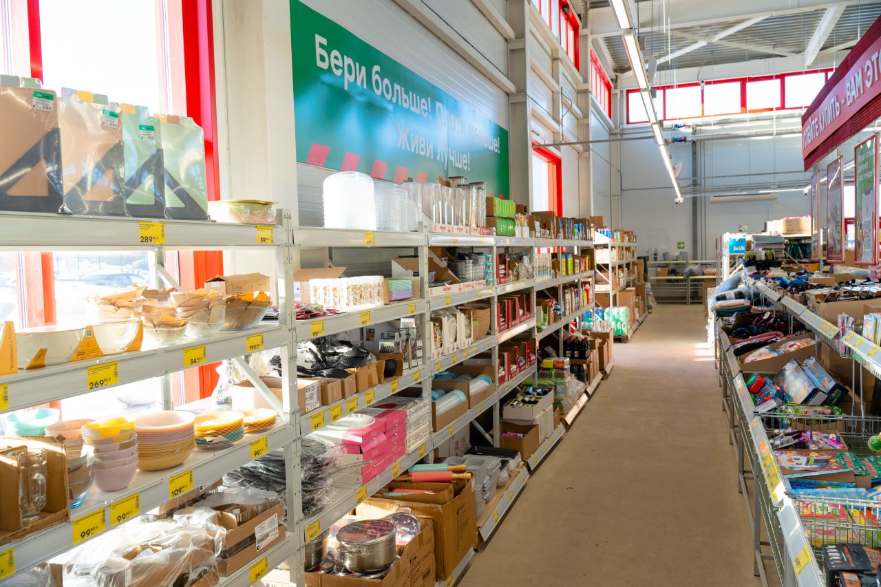 Магазин работает по принципу продсклада: товары расположены в торговом зале на паллетах и стеллажах в заводских упаковках, что позволяет использовать всю площадь торговой точки, не переплачивая за выкладку и дополнительные помещения. Компания сотрудничает с местными и федеральными производителями напрямую, не тратя время и деньги на посредников. Торговая сеть ПОБЕДА рационально подходит к собственным тратам, чтобы обеспечить низкие цены для покупателей.