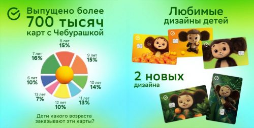 Новый выпуск детских СберКарт с Чебурашкой тоже ограничен. Заказать такую можно ребёнку 6–13 лет в приложении СберБанк Онлайн.