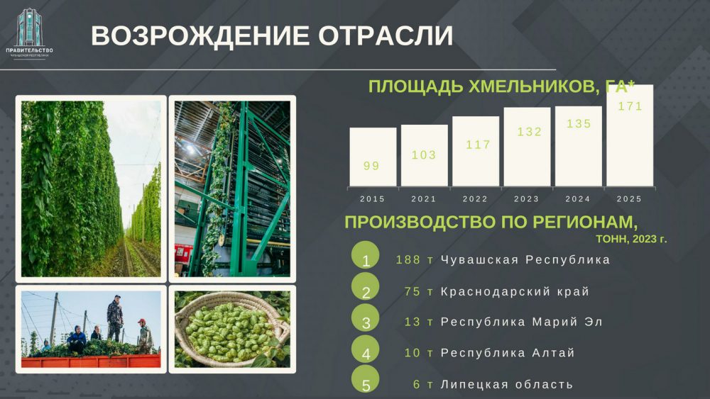 Но перелом наступил. Благодаря росту интереса к локальным продуктам, крафтовому пивоварению и первым точечным мерам поддержки, с середины 2010-х годов началось медленное, но уверенное восстановление. Уже к 2024 году площадь плодоносящих насаждений увеличилась до 135 гектаров, а валовой сбор хмеля в 2023 году составил 188 тонн, что вновь позволило Чувашии занять лидирующую позицию в России, опередив Краснодарский край и другие регионы.