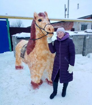 Фигуры получились высокими, так что женщине во время лепки пришлось использовать лестницу. По всей видимости, недавние снегопады вдохновили мастерицу, и она вылепила еще одну скульптуру — тоже лошадь.