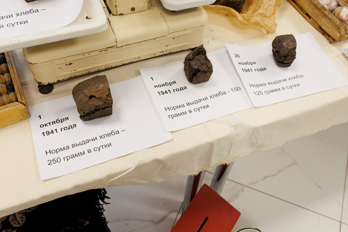 Много внимания привлекала на выставке инсталляция блокадного хлеба. Представители Чебоксарского техникума технологии питания и коммерции постарались воссоздать максимально точный рецепт. Хлеб выпекался из столярного клея и обойной муки, для калорийности добавляли семена льна, а для вкуса — немного соли. На целый день выдавался кусочек в 300 граммов, но в тяжелый месяц норма и вовсе сократилась до 125 граммов для пожилых и детей.