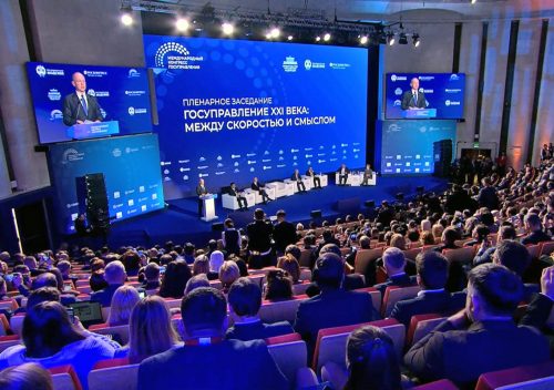 Работу пленарной сессии «Госуправление XXI века: между скоростью и смыслом» открыло приветствие Президента России Владимира Путина, которое зачитал первый заместитель руководителя Администрации главы государства Сергей Кириенко. Владимир Владимирович пожелал участникам Конгресса плодотворных и содержательных дискуссий, а также воплощения в жизнь намеченных планов.