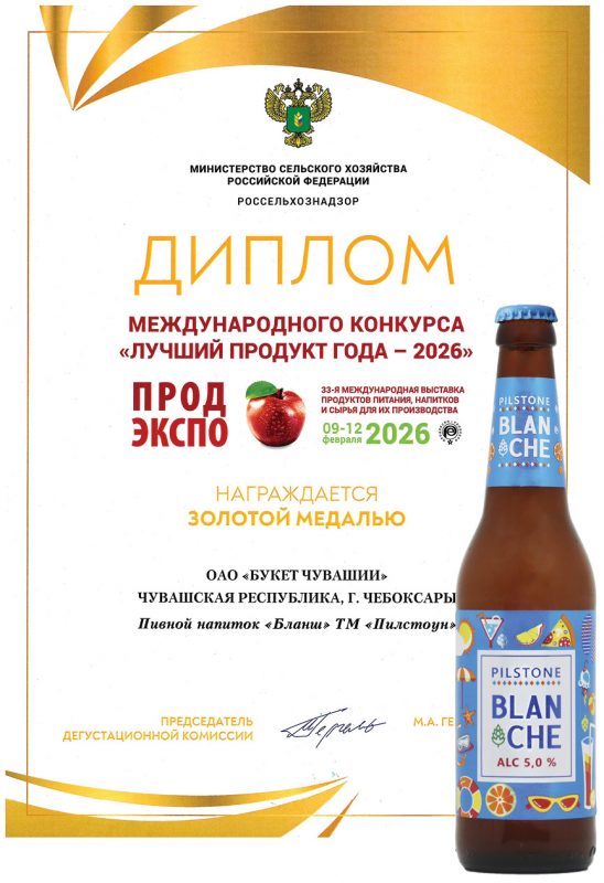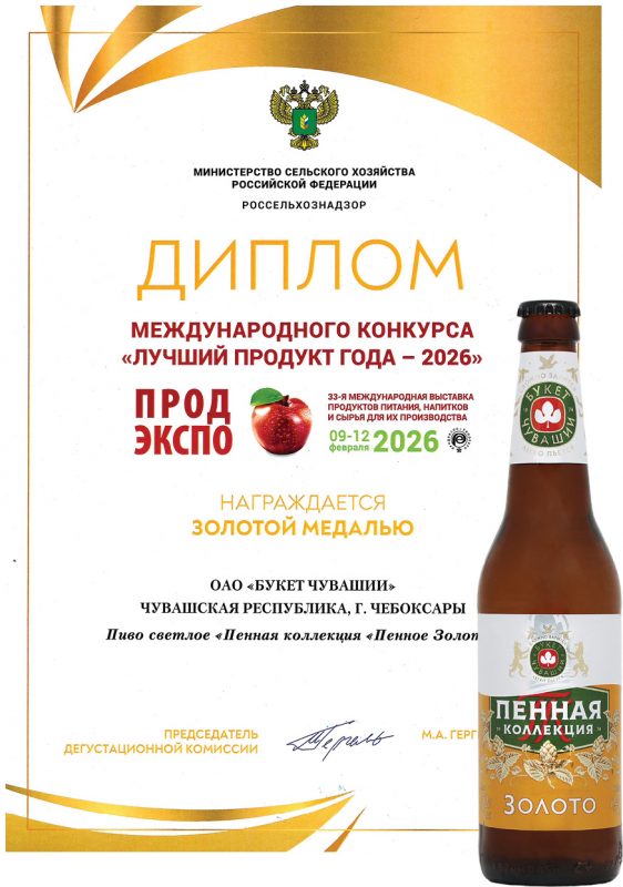 Экспертная комиссия по достоинству оценила безупречное качество, неповторимый вкус и оригинальность представленных образцов. Но главный сюрприз ждал компанию впереди: помимо золотых медалей за отдельные продукты, «Букет Чувашии» был удостоен особого признания — Золотого кубка «За постоянство и качество». Эта награда стала символом доверия к предприятию, которое на протяжении десятилетий остается верным традициям чувашского пивоварения.