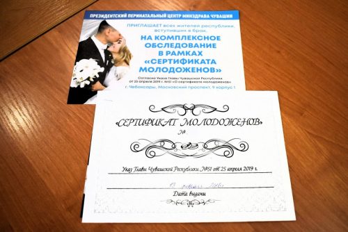 Пройти комплексное медицинское обследование мужчины и женщины могут в течение года со дня регистрации брака. Что же оно включает? Для женщин — консультацию врача-акушера-гинеколога, УЗИ органов малого таза, общий мазок на флору. Для мужчин — консультацию врача-уролога, общий мазок на флору, проведение спермограммы. Обследование проводится в Президентском перинатальном центре и ГКБ № 1 в Чебоксарах. При себе супругам необходимо иметь паспорт, полис ОМС, свидетельство о регистрации брака, «Сертификат молодоженов».