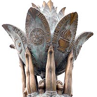 У бронзового с зеленоватым отливом лотоса семь раскрытых лепестков. На них можно прочитать доступные пониманию каждого слова: любовь, мир, истина, праведность, ненасилие, мудрость, служение. Число лепестков символизирует семь религий, а сам лотос — единение народов и культур. Изящный цветок держат на вытянутых руках семь девушек, вставших в круг.