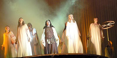 На самом деле ливень с грозой, бушевавший над городом, чуть было не нарушил цельность представления. В зале театра оперы и балета перед началом спектакля то гас свет, то пропадал звук. Надежде Бабкиной, вышедшей к зрителю перед спектаклем с приветственным словом, приходилось обходиться без микрофона. Тонна аппаратуры, без которой немыслим любой мюзикл, даже фольклорный, при очередном замыкании от грозового разряда становилась угрожающе беспомощной. Все это могло сильно смущать зрителей и техперсонал за кулисами. Но только не народную артистку, привычную ко всему. «Не пугайтесь! – успокоила она всех, – мы будем продолжать, что бы ни произошло. Своим спектаклем мы хотим напомнить, что мы живем не каждый сам по себе. Что мы вместе. Ну, с Богом!» После таких слов больше не было ни единой заминки.