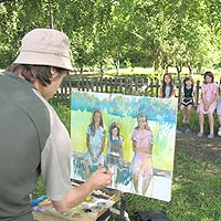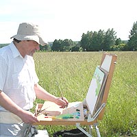 С первого дня запечатлевают маслом и пастелью живописные окрестности, пишут натюрморты и портреты заслуженный художник Чувашии Иван Даренков, гость из Хакасии Александр Кобыльцов, а также трое посланцев Украины – Александр Чередниченко, Сергей Коморный, Леонид Сторожук. Их творческой колыбелью
