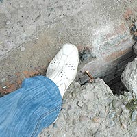 Неладно в доме не только у первого подъезда. У третьего внезапно образовался провал близ канализационного люка. С ним долго возиться не стали, нашли быстрое решение: прикрыли… фанеркой. Может, и дыры в ступенях бумагой заклеят?