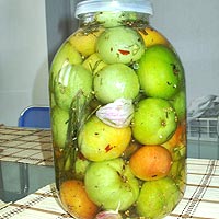 Мелкие зеленые помидоры промывают, очищают и укладывают в банки, перемежая мелким луком, укропом и хреном. Воду, уксус, сахар, соль, черный перец, лавровый лист и горчичное семя кипятят и еще горячим рассолом заливают помидоры. Банки прикрывают крышками и оставляют до следующего дня. Затем рассол с помидоров сливают, кипятят и горячим заливают помидоры. Банки закрывают и ставят в темное и холодное место.