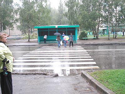 А шумим-то с чего? Оказывается, сооружение сие перегородило весь тротуар на самом оживленном месте: в двух шагах – магазин, тут же – остановка всех трех видов общественного транспорта, пешеходный переход в сторону лесопарка и храма Св. Татианы. И упирается «зебра» прямо в пасть бандуры. Толчея тут и раньше была, а теперь ее еще больше стало. Более того, увеличился риск попасть под колеса.