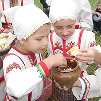 И непонятно, на кого больше пялилась местная ребятня, на участников фольклорного коллектива «Эткер» или на чернокожего улыбчивого гостя. А уважаемый посол Республики Нигерия в Российской Федерации доктор Сэм К Мбамбо даже про девушку-переводчицу забыл. Глаз не мог оторвать от сказочного действа. Вот этнический персонаж Терлемес, якобы основатель станции Тюрлема, идет по лесу, исполняя старинную чувашскую песню. Подходит к дуплам деревьев и достает из них мед. Односельчане благодарят его за работу. Старика обступает толпа ребят и подростков с кусками хлеба, он намазывает им хлеб свежим медом. То-то радости детям. Наступает черед угощения взрослых.