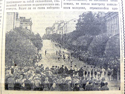 «Родившись в Чебоксарах в 1932 году, пробег стал хорошей традицией для городских физкультурников и физкультурниц. Позавчера на старт снова вышли сотни бегунов, объединенных в 60 команд, – читаем мы в номере «СЧ» за 16 сентября 1952 года. – Тысячи чебоксарцев заполнили Красную площадь и центральные улицы города (большинство из них ныне находятся на дне Чебоксарского залива. – Авт.), по которым пролегала трасса пробега, чтобы посмотреть на увлекательную спортивную борьбу».