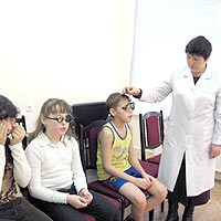 Первое, что бросается в глаза: по зданию ходят люди в белых халатах. В школе действует свой центр медицинской реабилитации с восстановительно-оздоровительным и профилактическим отделениями. Кабинет охраны зрения, к примеру, не пустует. Ребятишкам и зоркость глаз проверят, и о тренировке мышц позаботятся. Вот сидит мальчик и читает буквы с таблицы, а окулист меняет ему минусовые линзы в устройстве, напоминающем очки. Как объяснила врач, так проходит лечение близорукости по Дашевскому. В это время за соседним столиком девочка проходит курс реабилитации зрения на аппарате цветоимпульсной терапии «АСИР».